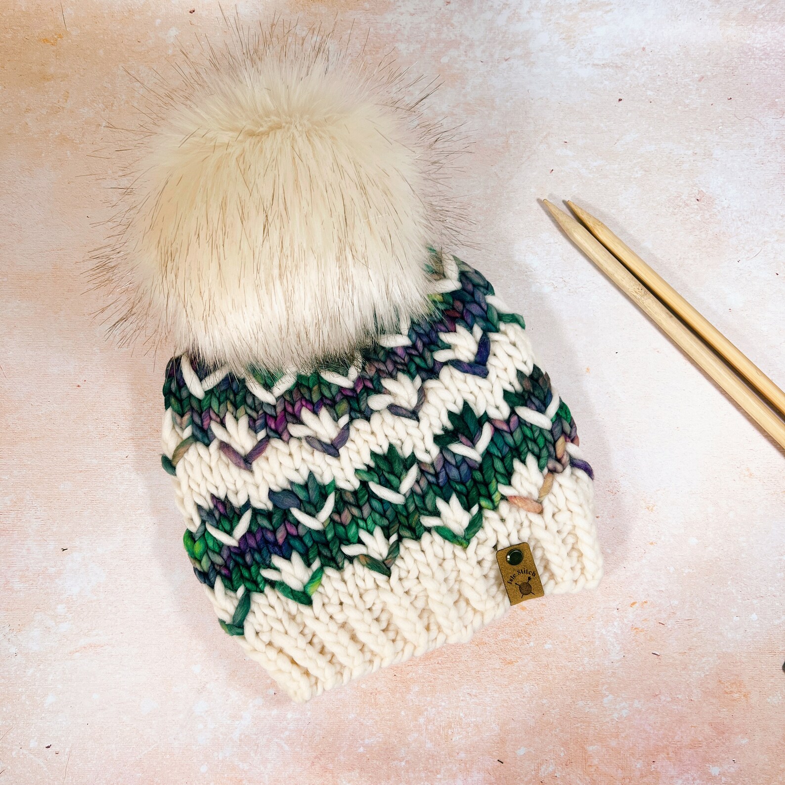 It comes with a removable faux leather Isle Stitch brand tag that is held in place with a brass rivet and a removable faux fur Pom Pom which is optional. Matching cowl available.